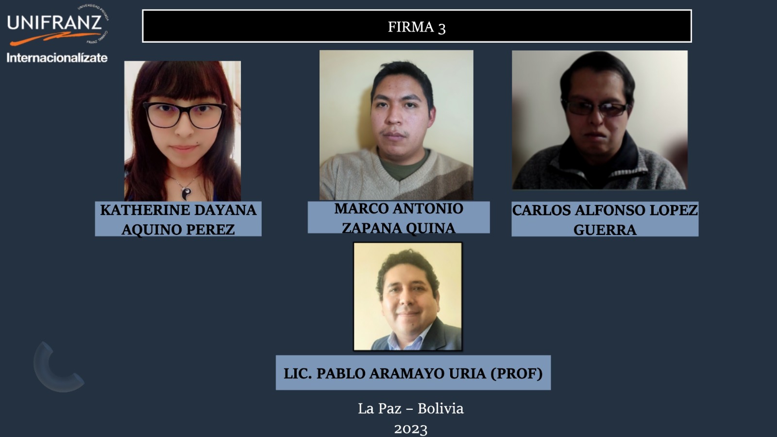 ALVARO MOLINA LIMPIAS, FRANCO RIVERO TORRICO, JANETH OJEDA CANAZA, KAREN PATRICIA CLAROS VALLE (PROF)
